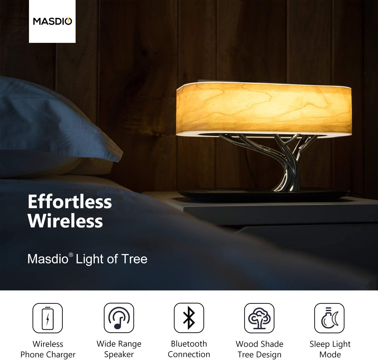 • Bedside Lamp with Clean Design - Wireless Charger, Bluetooth Speaker and Desk Lamp all in one. Naturally comfortable infinitely dimming lights with cherry wood blackout shades will add sparkle to your home.